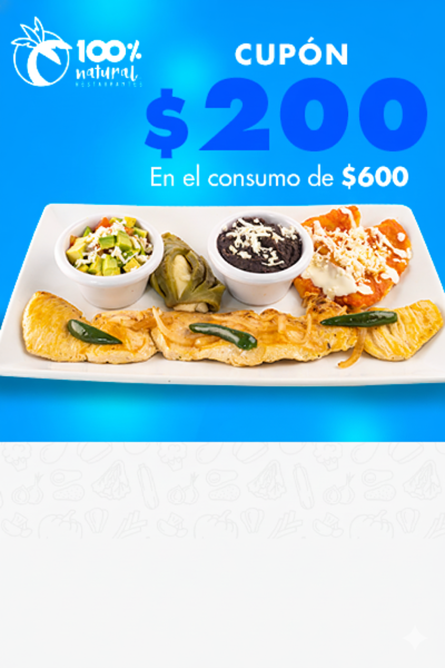 Presenta este cupón al momento de ordenar para hacer válido el beneficio en los restaurantes 100% natural, excepto Cancún y Chilpancingo. Descuento de $200 en consumo mínimo de $600. No válido con otras promociones, paquetes, descuentos ni para redención con tarjeta Puntos 100. Válido solo para consumo en restaurante, no aplica para llevar ni en servicio a domicilio. No aplica en salones. Válido un cupón por cuenta. No canjeable por efectivo. Vigencia 23 de Diciembre 2025.